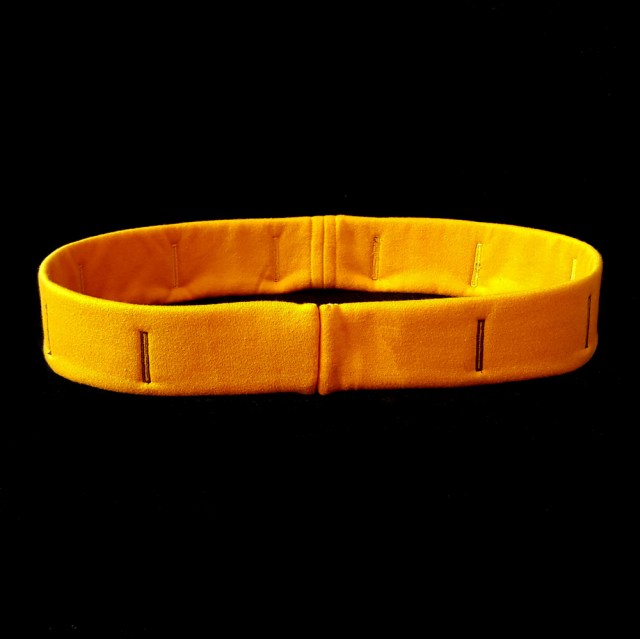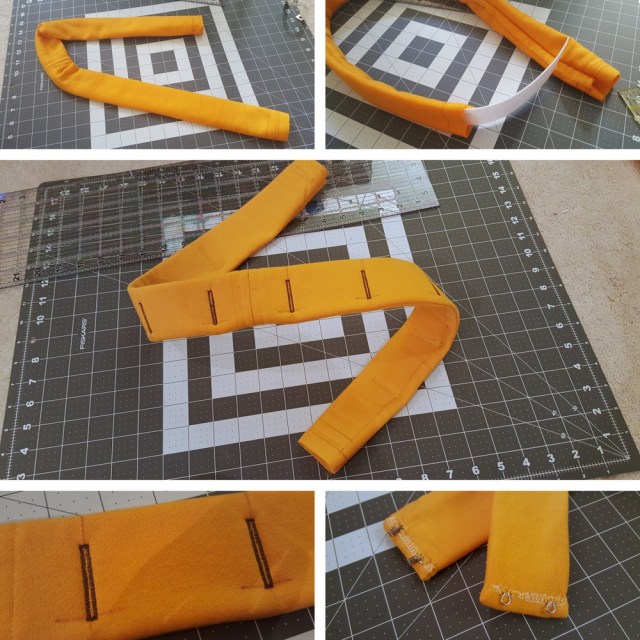 - Belt (yellow sweatshirt fleece, heavy interfacing, hook-and-eye closures)