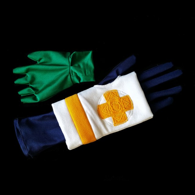 For both the right-hand navy glove and left-hand green glove, pretty much any glove tutorial on the internet will work. I stuck with a basic trace-your-hand, sew, cut, and good luck tutorial. A few things to note though, are to trace the fingers a little bit longer than your actual fingers, and to make the stitches that go in the tiny notches between your fingers more “boxy” as opposed to “angular” (I’ve found that this helps the glove look a little neater when you turn it back right-side out).