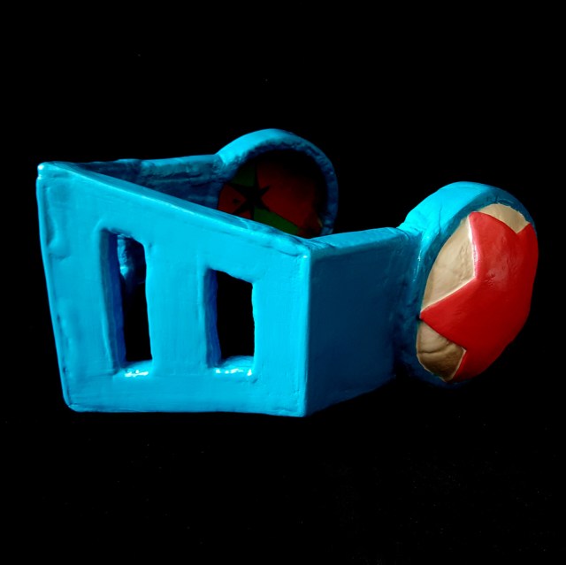 The helm was made as much from scratch as possible, for no reason other than to make this as frustrating as possible for me. The earpieces were made out of craft foam, generously massaged into as circular a shape as possible, and then smothered with Worbla.