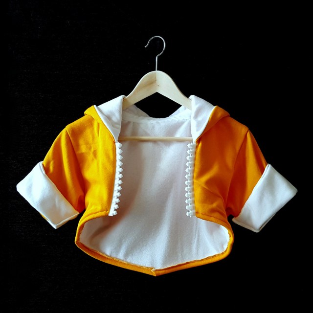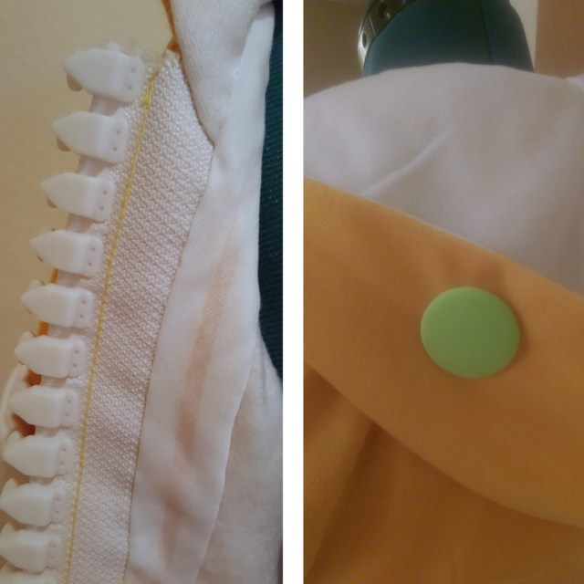 - Jacket (yellow and white sweatshirt fleece, #30 gauge zipper, white bias tape, 1.5″ button, light green dance/swim knit)