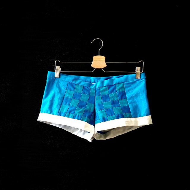 - Shorts (dark, medium, and light blue Kona cotton, white lining fabric, zipper)