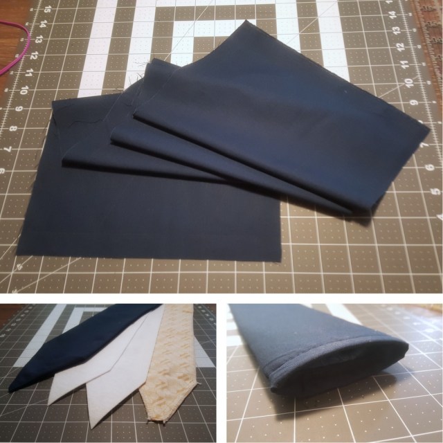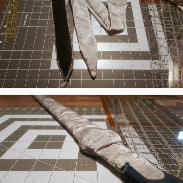 The main blade of the sword was comprised of an outer shell of “actual blade” and then an inner shell that would eventually house the acrylic rod I would be using for structure. For the outer shell, I lightly interfaced the fabric to add some light structure (and to keep the fraying in check). Some light top-stitching detail was also added to the blade. For the inner shell, quilted batting was used.