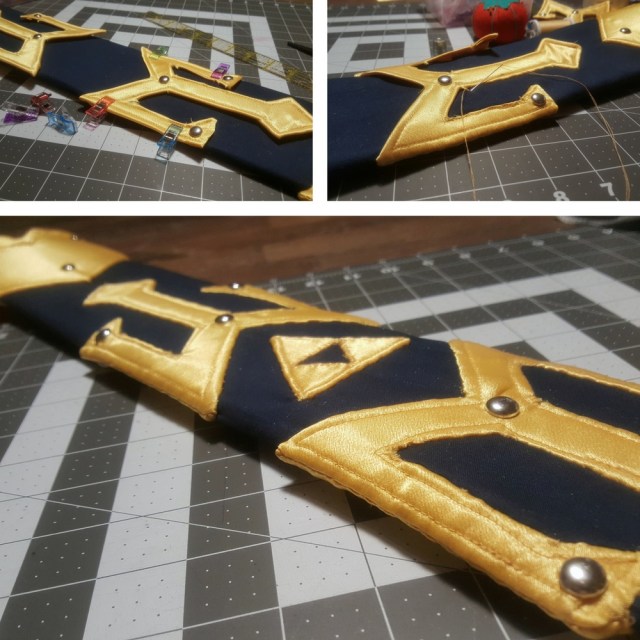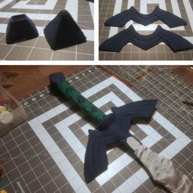 I started with making the scabbard as it was the first thing that caught my eye for this iteration of the Master Sword. The basic scabbard structure was an outer shell, an inner lining shell, and a few layers of heavy craft interfacing sandwiched in-between them.