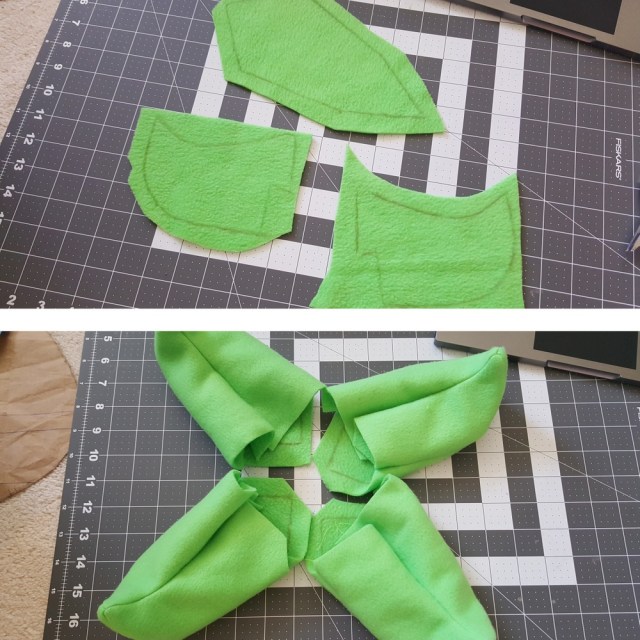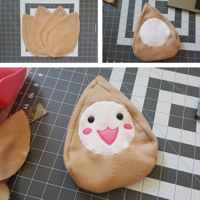 The head was constructed from 4 petals, with the face sewn on prior to sewing all of the 4 petals of the head closed. The face detailing was first attached using fabric glue (as pinning could have caused the tiny details to bunch up a bit) and then sewn on using a zig-zag stitch. The eyes were leftover craft eyes that I had from previous anthropomorphic crafts I’ve made.