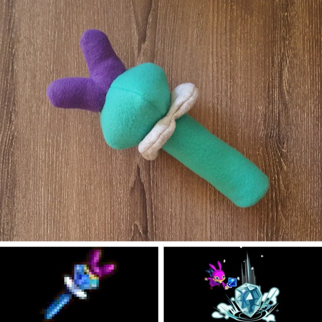 The Sand Rod required some creative plush squishing in order to fit all of the components together. The aluminum rod in this case, went through the entirety of the shaft, as well as through the “gem” to help anchor it in place.
