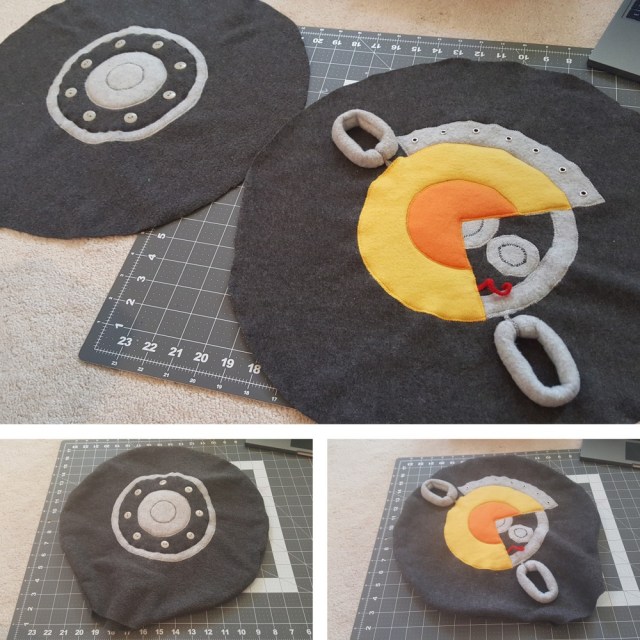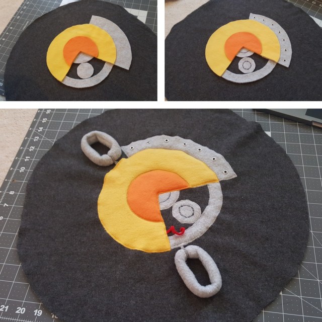 A large circular pillow form (not pictured) was used as the base for the tire as I was worried that hand stuffing would lead to it being weirdly squishy and amorphous. A lot of the original design of the RIP-Tire was simplified to make it more easily translatable to plush form.