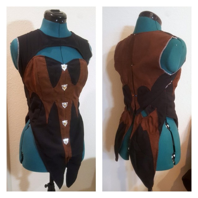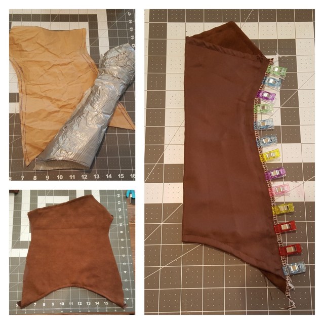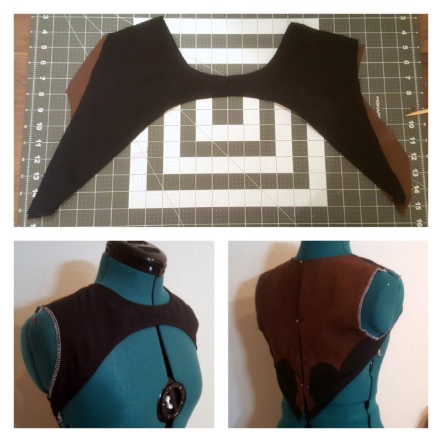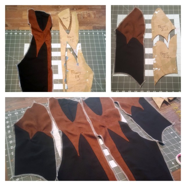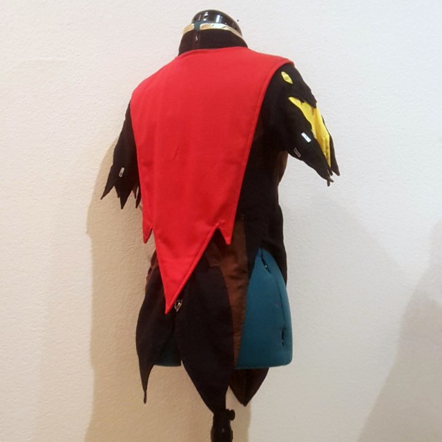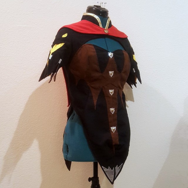 Once I had the paper patterns more or less finalized, came the long and arduous process of piecing together the top. The seams to incorporate the “wing” design on the front were easily the most time and pin consuming part of this cosplay. My underdeveloped quilting/seaming skills came to use as I “patiently” tried joining the fabric together with as little folds as possible.