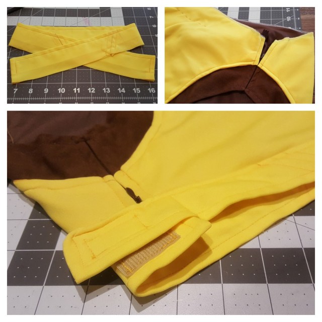 One of my prouder achievements with this project was that it was made using mostly leftover materials from previous cosplay projects. The brown microsuede was what remained from my overestimating with Sigrun Mercy, the yellow knit fabric from my Red, and the black fabric and red knit from a never started cosplay plan from almost 5 years ago!